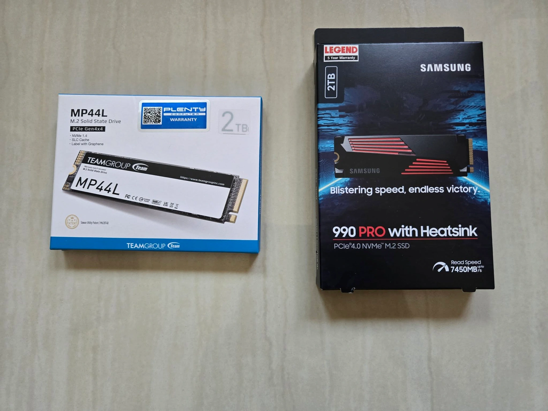 ซ้าย (ของเก่า): Teamgroup MP44L 2TB ราคาสามพันกว่าๆ ขวา (ของใหม่): Samsung 990 Pro 2TB ราคาเจ็ดพันห้า