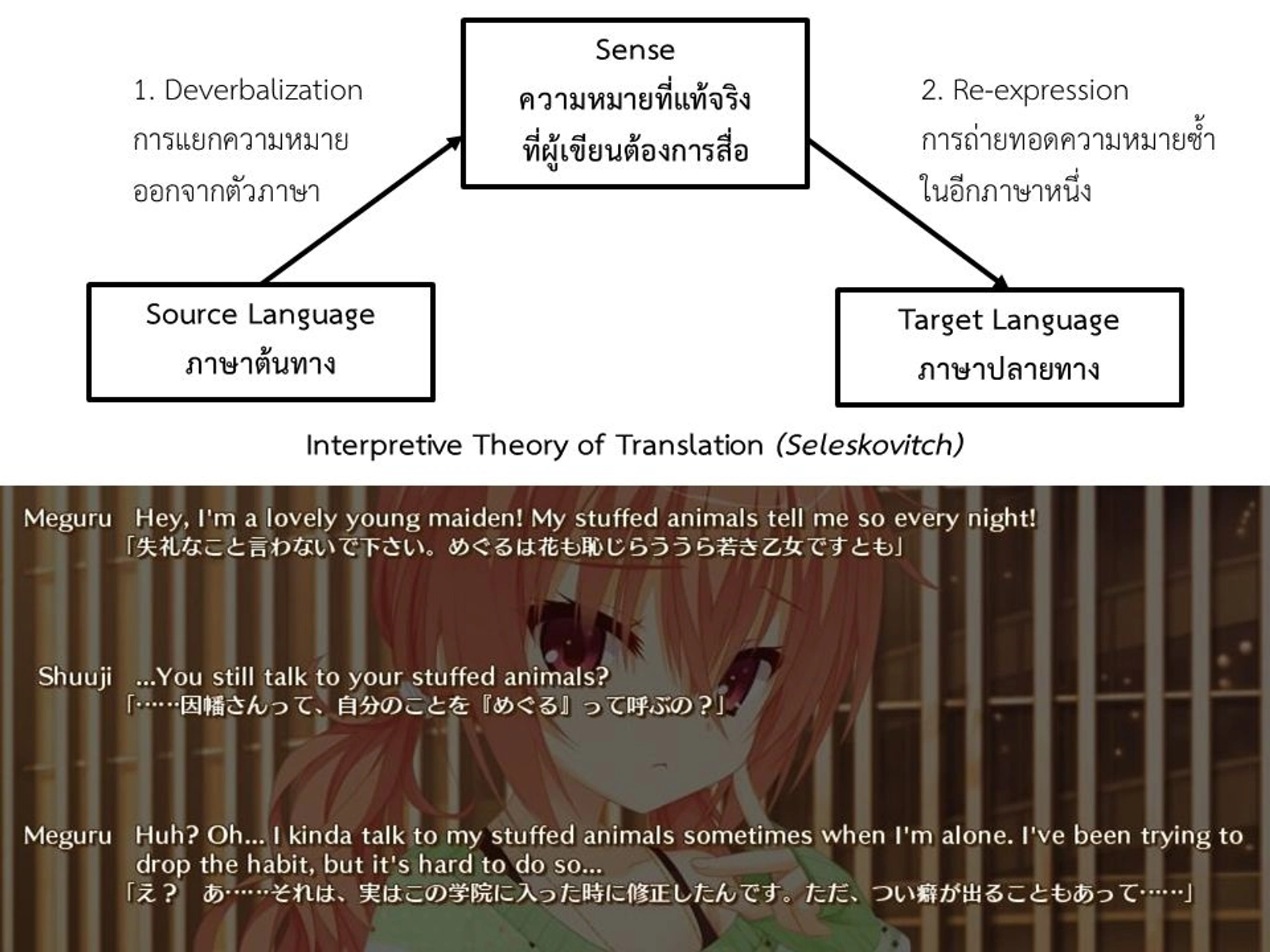 ดังนั้น การแปลว่า “You still talk to your stuffed animals?” (เธอยังพูดคุยกับตุ๊กตาอยู่เหรอ) จึงถ่ายทอดความหมายที่แท้จริงของผู้เขียนต้นฉบับได้ มีความเทียบเท่ากัน (equivalence) ตรงตามความหมายที่ผู้เขียนประโยคต้นฉบับต้องการสื่อ แม้ว่าไม่มีส่วนไหนของต้นฉบับภาษาญี่ปุ่นที่บอกว่าเมกุรุชอบคุยกับตุ๊กตาก็ตาม