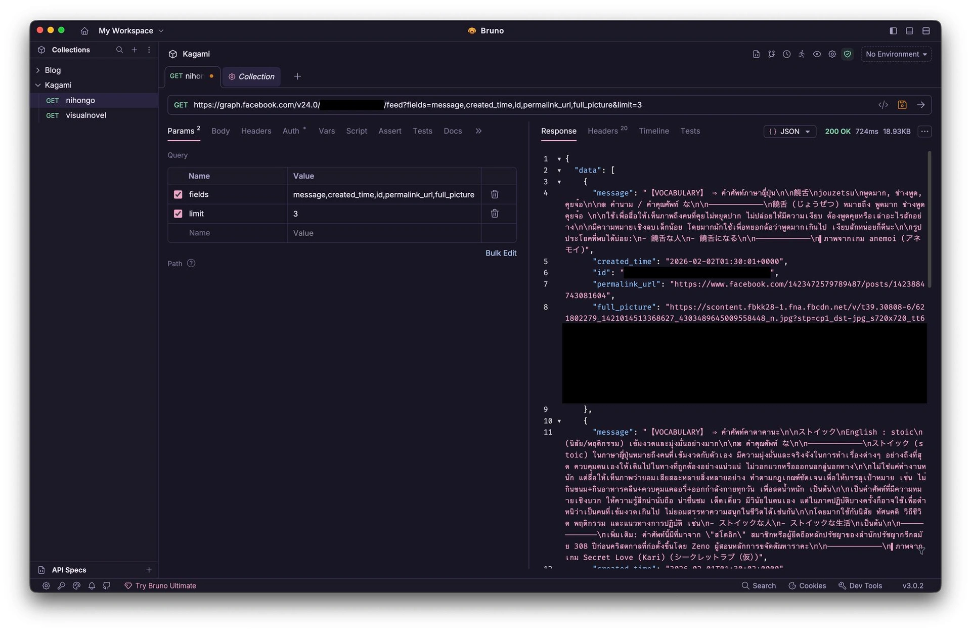 จนกระทั่งผมพึ่งมาค้นพบโดยบังเอิญว่าเฟซบุ๊คมี API ให้ใช้งานอยู่แล้ว พอลองทำตามขั้นตอนแค่แปปเดียวก็ได้ข้อมูลในรูปแบบ JSON ที่เอาไปใช้งานต่อได้ทันที ได้ข้อมูลครบถ้วนสมบูรณ์ทั้งข้อความและรูปภาพ สวยงามมาก