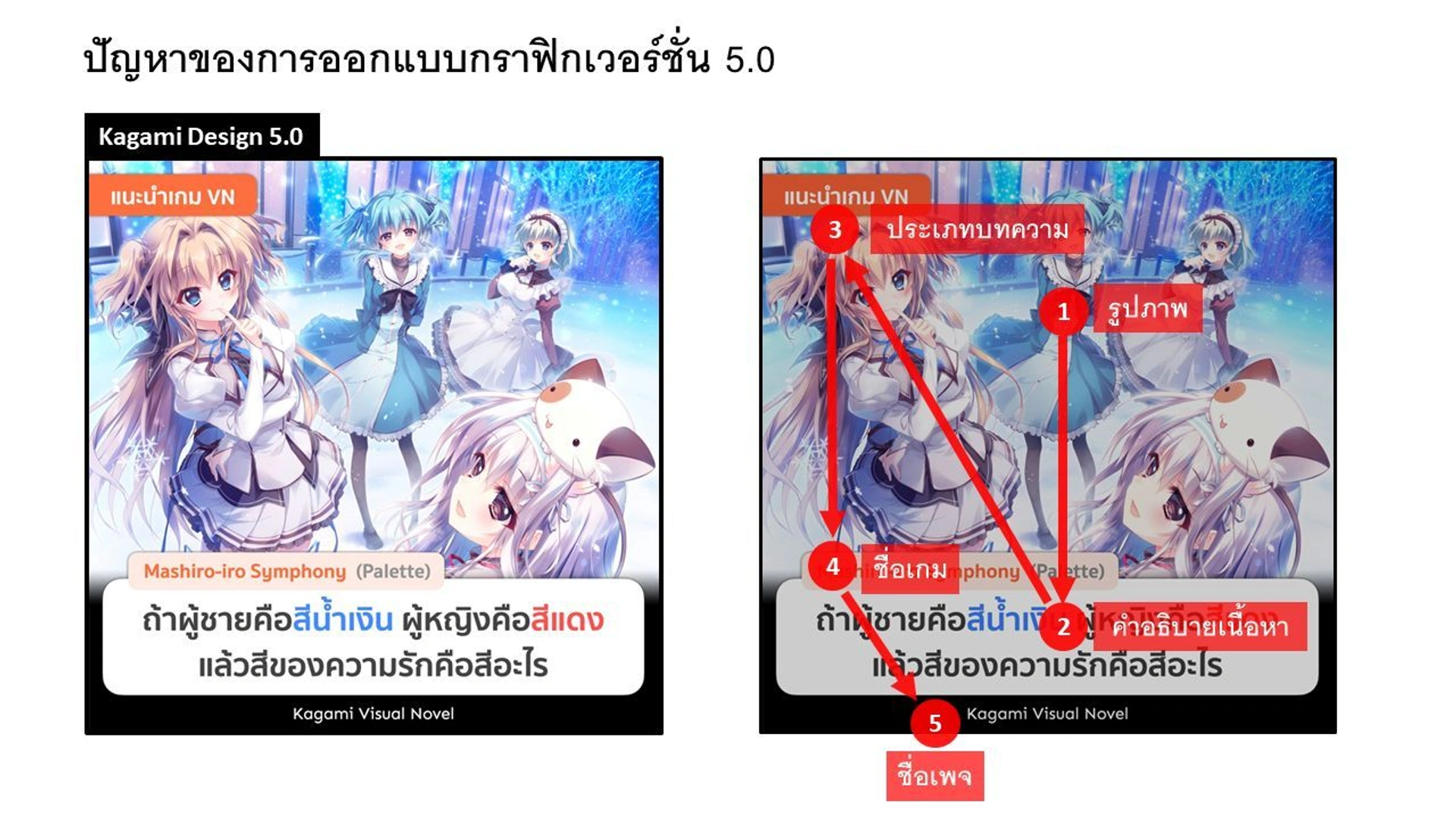 ด้วยเหตุนี้ผมจึงโยนดีไซน์แบบเดิมทิ้งไปและ “คิดใหม่ทำใหม่” ออกแบบใหม่หมดจด เรียกว่า Kagami Design 6.0 โดยงานกราฟิกเวอร์ชั่นใหม่นี้จะต้องแก้ปัญหาดังต่อไปนี้