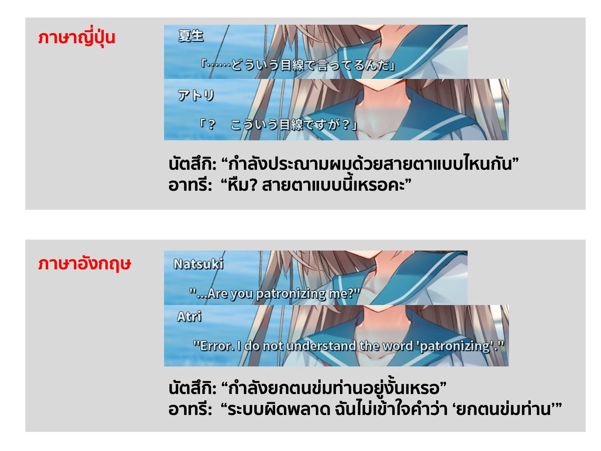 ก่อนหน้านี้เคยบอกไปแล้วว่าเกม ATRI ใช้วิธีการแปลแบบ Localization ที่เน้นการดัดแปลงเนื้อหาให้ผู้อ่านเข้าใจง่าย โดยสละความถูกต้องของเนื้อหาต้นฉบับบางส่วน