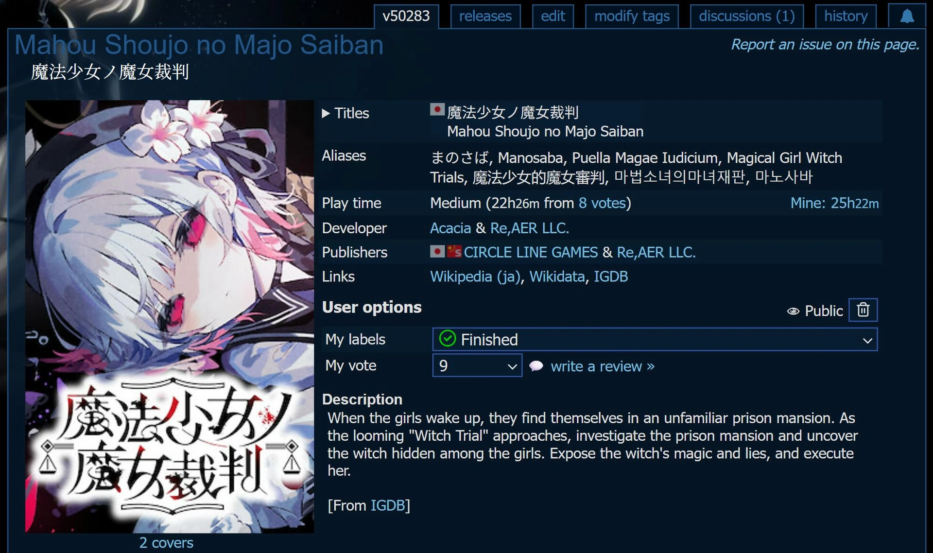 เล่นเกม Mahou Shoujo no Majo Saiban (魔法少女ノ魔女裁判) จบแล้ว บอกตามตรงว่าเหนือความคาดหมายอย่างยิ่ง สามารถให้คะแนน 9/10 หรือแรงค์ A+ (และแรงค์ S ในบางองค์ประกอบ) ได้แบบสบายๆ เลย